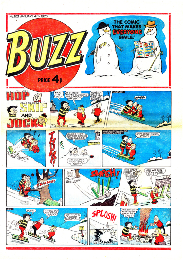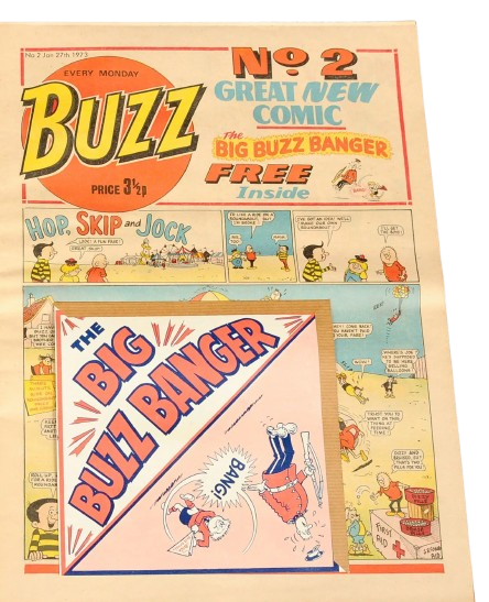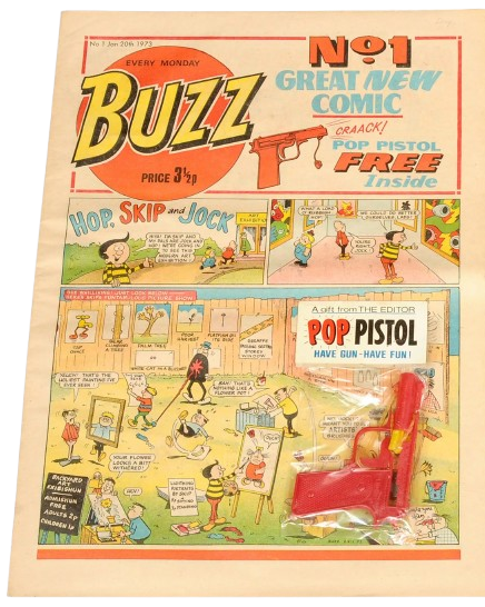 Buzz issue number one appeared on 20th January 1973 and included a free gift of a ‘Pop Pistol’. Stories in the first issue were ‘Hop, Skip & Jock’, ‘Nobby’, ‘Harum-Scarem!’, ‘Billy the Kidder’, ‘Tich & Snich’, ‘Gus the Galoot’, ‘Olly’s Occy’, ‘Big Fat Flo’, ‘Monty Money Bags’, ‘Skookum Skool’, ‘The Twitz of the Ritz’, ‘Fred the Flop’, ‘Wig & Wam’, “Willie the Wizard’, ‘Nero the Zero’ and ‘Calamity Kate’.