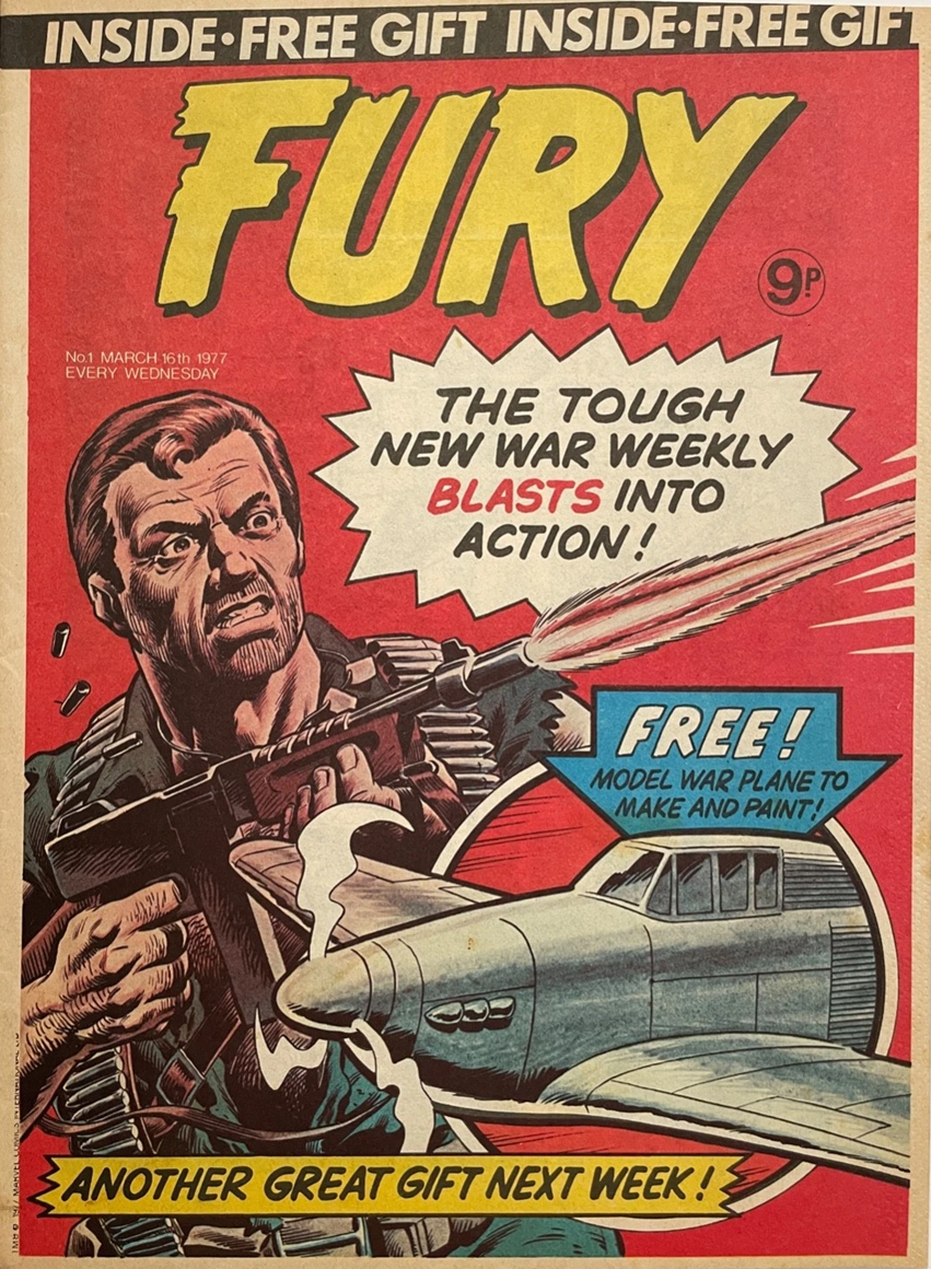 Fury issue number one appeared on 16th March 1977 and included a free gift of a ‘Model War Plane.’ Stories in the first issue were: ‘Helpless,’ ‘7 Doomed Men,’ ‘Fokker’ and ‘The Last Banzai,’Fury later Joined with ‘Mighty World of Marvel.’