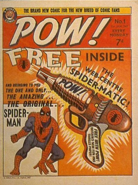 ‘Pow!’ comic was a mixture of British comic strips and American reprints. The first issue of ‘Pow!’ came with a ‘Spider-Matic’ gun and ammo. stories in the first issue were ‘Spider’Man’ (Spider-Man 1), ‘Nick Fury – Agent of Shield’ (Strange Tales 35), ‘The Python’ (Borrel), ‘Jack Magic’, ‘Dolls of St. Dominics’, ‘The Group’ (Baxendale) and ‘Dare-a-Day Davy’ (Ken Reid).