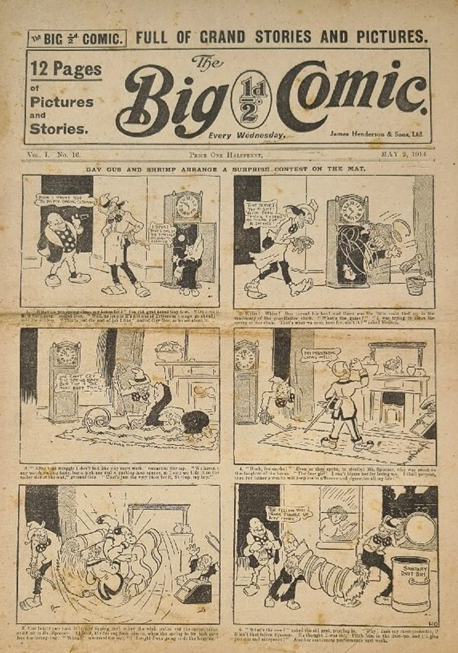 Issue number one of ‘The Big Comic’ introduced the adventures of ‘Gay Gus’ and ‘Shrimp’ (H. O’Neil) which was the story of two friends, one tall and one short. The pair got into many scrapes and with the outbreak of the World War One they were conscripted in to the army where they were launched on an unsuspecting German army. Other stars of ‘The Big Comic’ included ‘Lemon and Dash’ (Louise Briault) who had previously appeared in ‘Sparks’ comic.