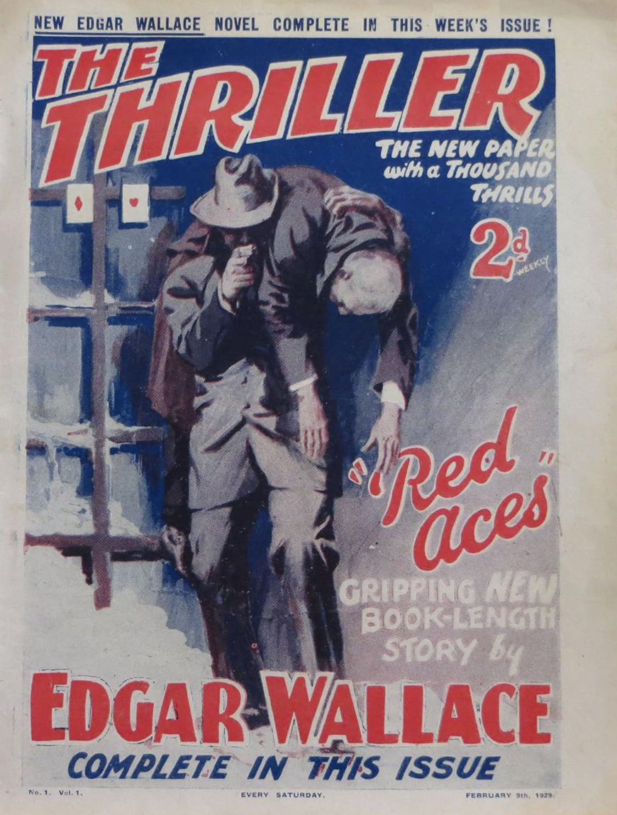 Along with many other comics and story papers of the period, ‘The Thriller’ came to an end in 1940 due to paper shortages at the outbreak of the Second World War. It ran for 589 issues, some 11 years. Its authors, reads as who’s who of the literary world including the likes of Edgar Wallace, Leslie Charteris, W.E. Johns, and John Creasey. The first issue saw a story by Edgar Wallace, entitled, ‘Red Aces.’
